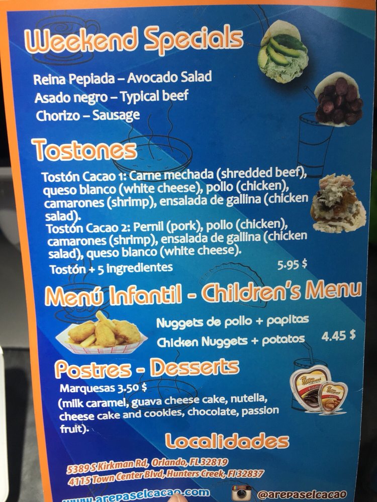 Introducing Arepas El Cacao, a hidden gem in Orlando offering authentic Venezuelan street food. Located at 5389 S Kirkman Rd, this casual yet classy spot is perfect for a relaxed lunch, dinner, or late-night snack. With options like the flavorful Queso Paisa Arepa or the indulgent Canchapa Con Queso Cachapas, your taste buds will thank you. Customers rave about the delicious food and friendly staff, making it a must-visit destination. Don't miss out on the cafe offerings like Cafe Espresso or Cafe Con Leche to complete your meal. Whether you're a fan of pork, cheese, or a combination of flavors, Arepas El Cacao has something for everyone. So, if you're in the area, stop by and experience the true essence of Venezuelan cuisine.
